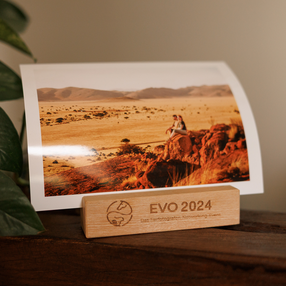 Jeder Halter ist ein Unikat: Farbe und Maserung variieren, weil echtes Holz eben Charakter hat. Die feine Gravur „EVO 2026“ erinnert dabei an das, was uns verbindet – Leidenschaft, Austausch und Gemeinschaft in der Tierfotografie.